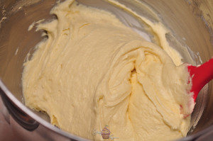 Preparare: Preincalziti cuptorul la 180C si tapetati fundul unei tavi cu hartie de copt. Pentru a pregati blatul puteti folosi robotul cu paleta atasata, un mixer de mana sau o lingura de lemn. Untul moale se mixeaza cu zaharul pentru 3-4 minute dupa care se adauga ouale pe rand si se incorporeaza cu robotul setat pe viteza mica. Nu adaugati urmatorul ou pana nu se incorporeaza complet cel de dinainte.
