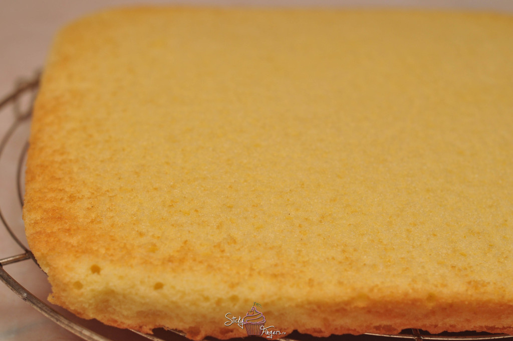 Inca o reteta minunata marca Lorraine Pascale, de data asta a unui blat de vanilie usor umed si dens. Reteta e simpla si usor de adaptat pentru orice tava. Pentru 1 ou mare folosim 60g unt moale, 60g zahar si 60g faina + extract de vanilie, praf de copt si un praf de sare. Lorraine a adaugat toate ingredientele de la inceput in bol si le-a mixat asa, eu am ales sa pregatesc blatul difert. Ne mai atentioneaza ca putem folosi si margarina in caz ca nu avem unt in casa, astfel ne putem apuca imediat de blat si nu mai trebuie sa asteptam sa ne inmoaie untul. Inca un sfat care vine din partea mea, ouale trebuie sa fie la temperatura camerei. Recunosc, eu niciodata nu scot ouale in avans din frigider si nu am facut-o nici acum dar…..i-am scufundat in apa calda pentru 15 minute. Daca adaugam oua reci peste untul moale sunt sanse sa se taie, asadar ca sa evitam asta adaugam oua la temperatura camerei. La final rezulta o compozitie fina si pufoasa care se transforma intr-un blat delicios. Nu e la fel de umed ca si blatul umed de cacao dar se apropie. In poza de sus este un blat din 3 oua de aprox. 3 cm inaltime, copt in tava patrata de 24×24. Am folosit blatul sa pregatesc Tortul exotic (click pt reteta). In tava de 19-20 cm diametru se folosesc tot 3 oua si rezulta 2 blaturi generoase.