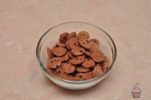 Se tapeteaza interiorul formelor de briose(din silicon) cu fulgii ciocolatosi si se pune in frigider pt 10-15 minute.