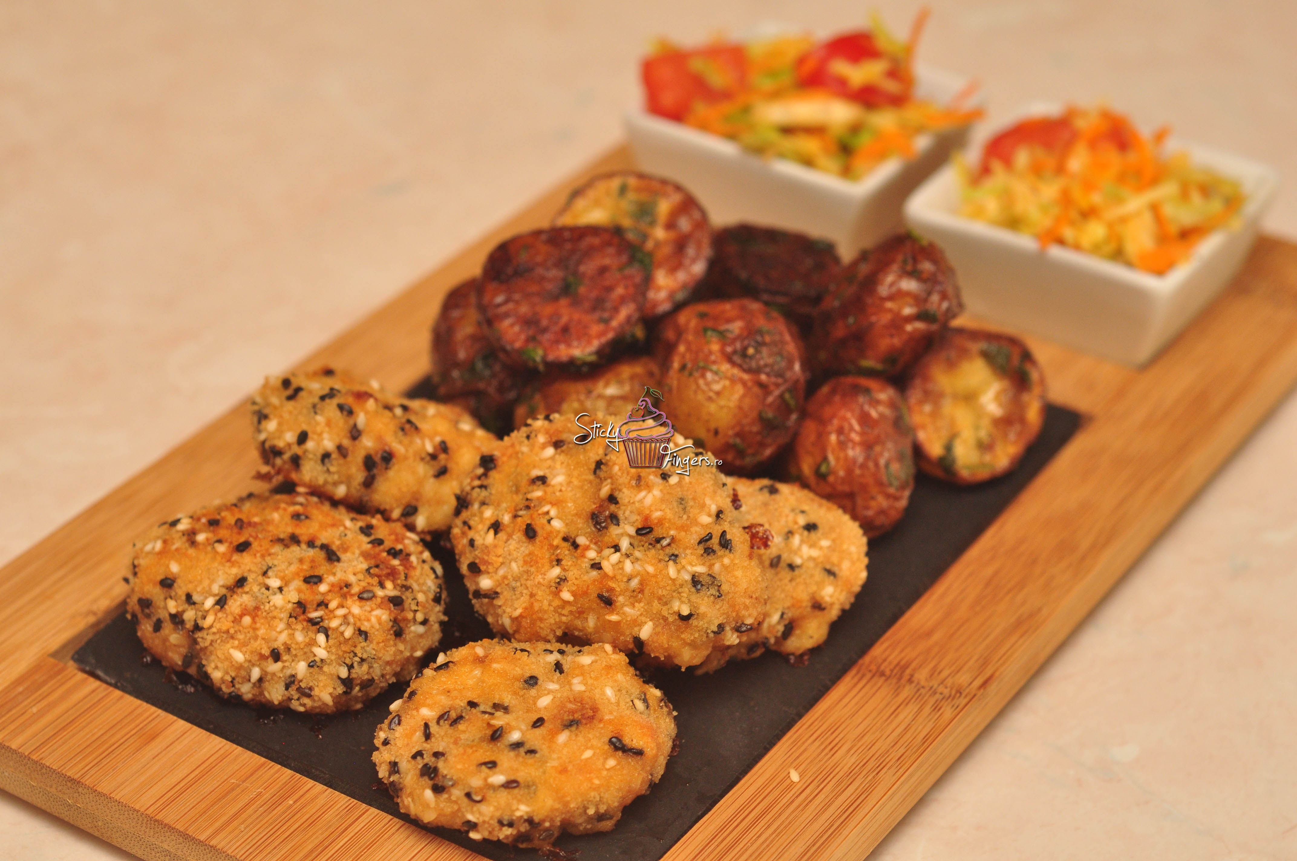 Preparare: Pieptul de pui l-am tocat in blender dupa care l-am amestecat cu ceapa verde si ardeiul tocate marunt, usturoiul zdrobit, patrunjelul verde+condimentele si le-am amestecat bine. Am format chiftelute plate pe care le-am tavalit prima data prin faina, dupa aceea prin ouale batute si la final prin pesmetul amestecat cu susan.