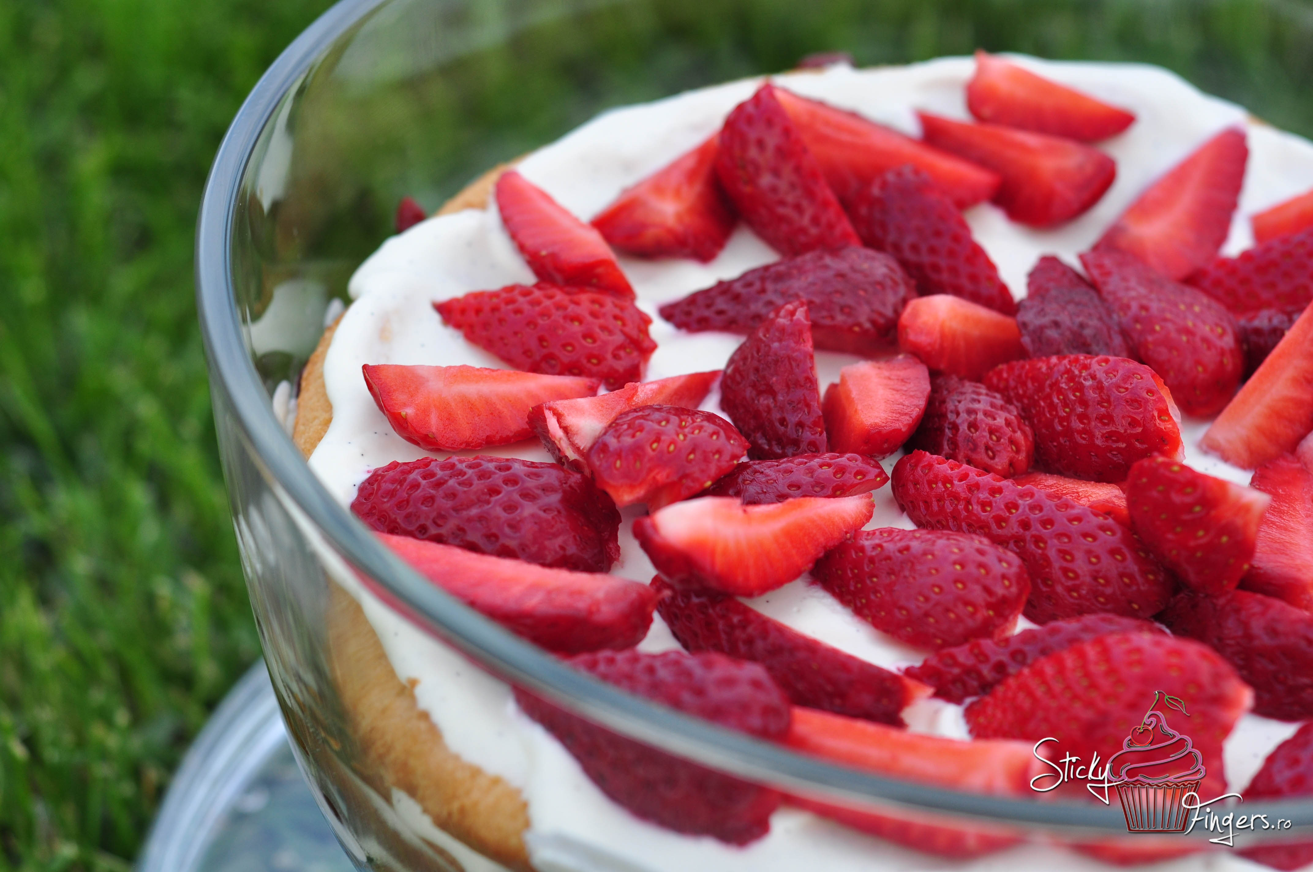Ce este un trifle? Eu as spune un tort construit intr-un bol de sticla. E nemaipomenit de gustos, usor de pregatit si gata mancat in aproximativ 1 ora. Recunosc ca l-am pregatit cand eram in plin sezon de capsuni, dar uitasem ca nu l-am postat pe blog. Dar nici o grija, capsunile se pot inlocui cu alte fructe.